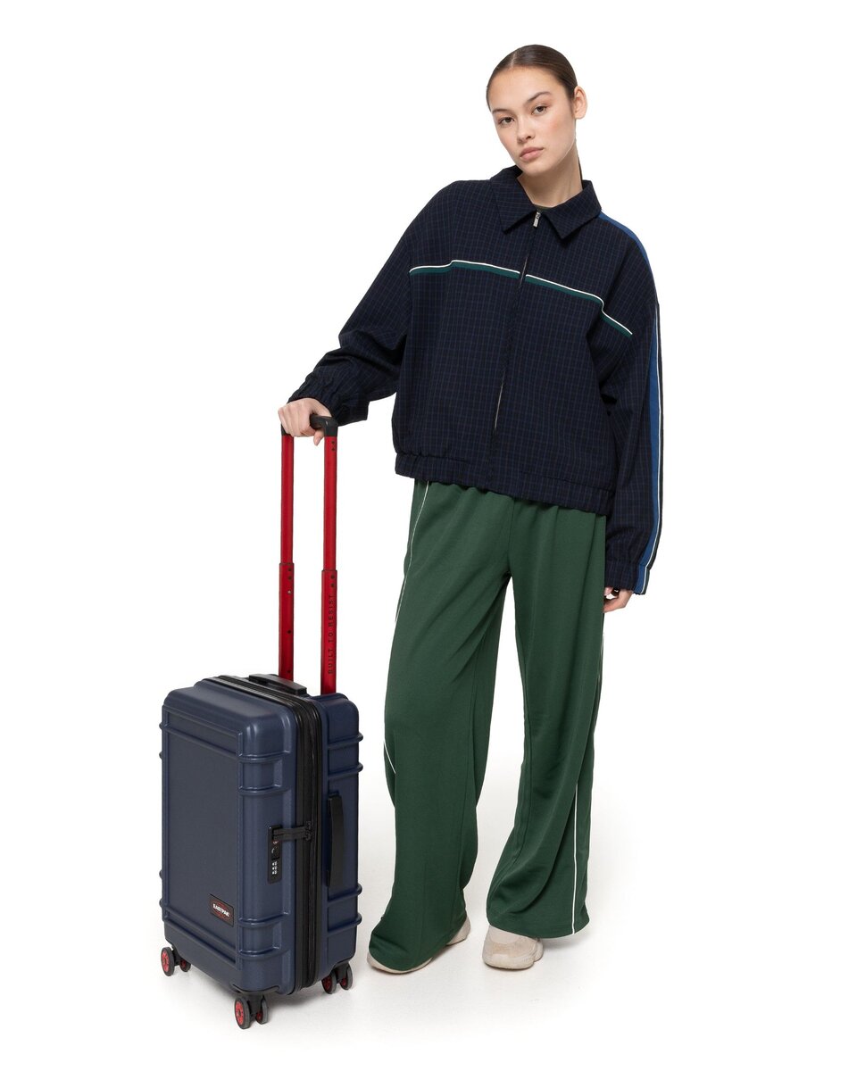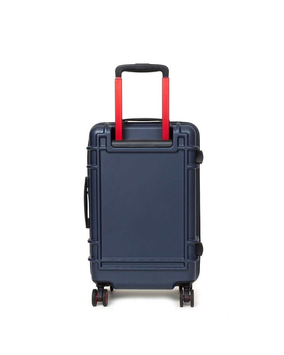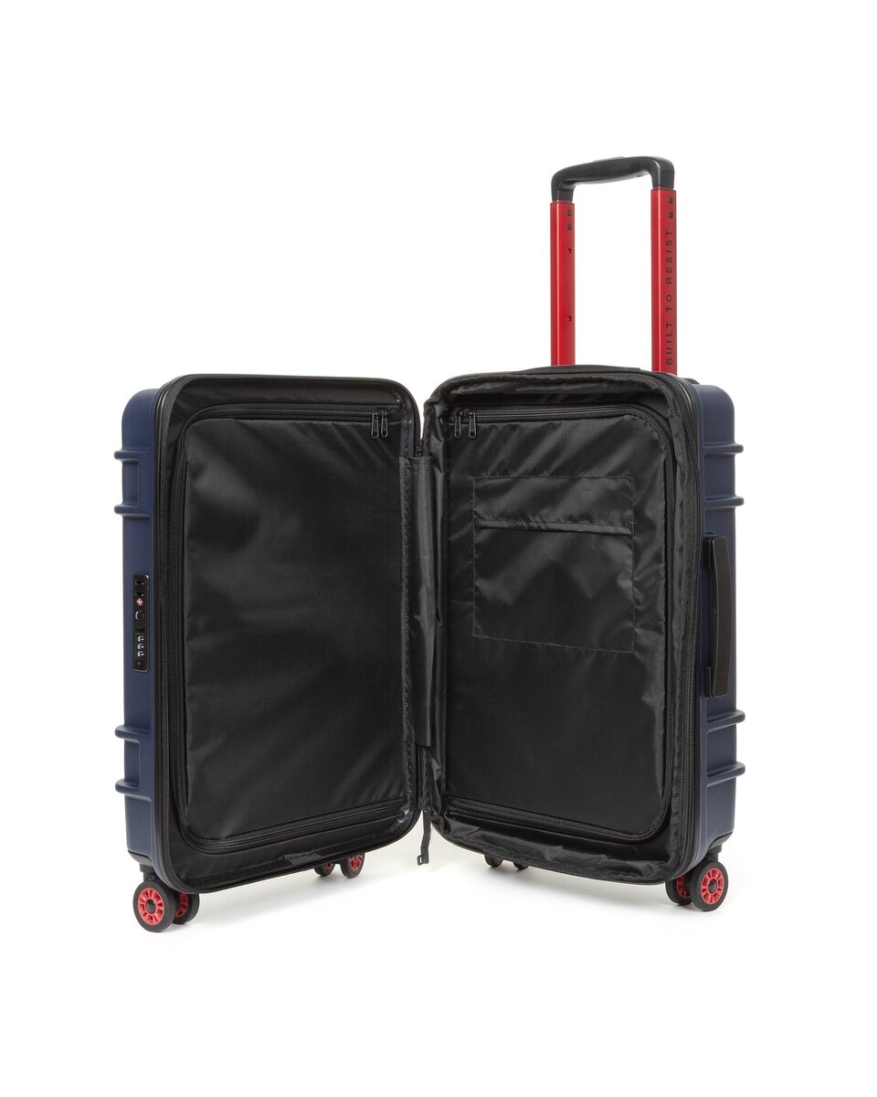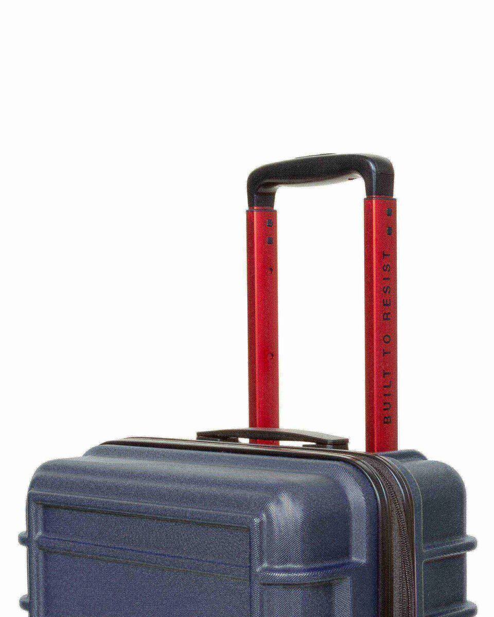 Our hardshell carry-on luggage features two zippered compartments for short trips and weekends away. The lightweight cabin bag stands out with red accent details, “Built To Resist” handle branding and Japanese 360-degree spinning wheels.